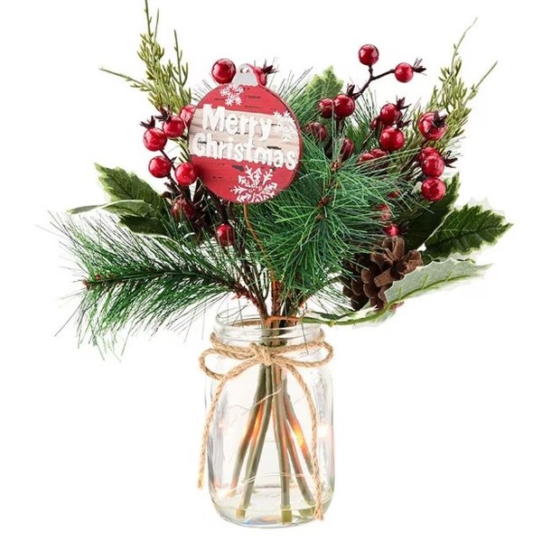 The vase is filled with realistic faux poinsettias, evergreen accents, and pink candy-inspired embellishments for a festive and playful look. The embedded fairy lights add a soft glow, making it an enchanting addition to mantels, tables, or entryways. Perfect for creating a cozy holiday ambiance, this vase decoration is a simple yet elegant way to elevate seasonal decor.